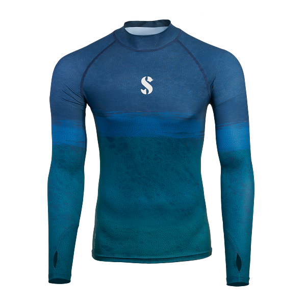 The four-way stretch fabric is lightweight, ultra-comfortable and retains its shape both in and out of the water. The form-fitting cut makes the rash guard ideal as a base layer under a wetsuit, and the high neckline helps prevent chafing during longer dives. With a UPF 50 rating, the shirt blocks 98% of UV radiation, keeping you protected in the sun.
